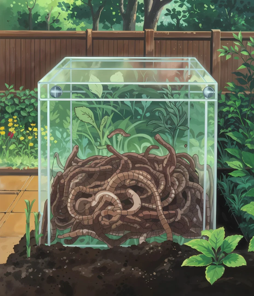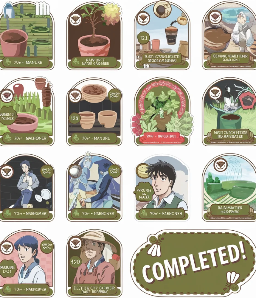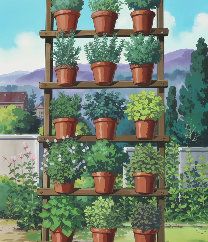 Vegetable beds, pots, compost pits, and seed-starting stations