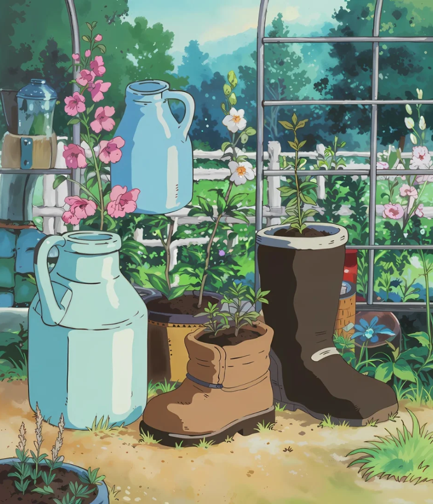 Upcycled Planters Section (featuring milk jugs and old boots)
